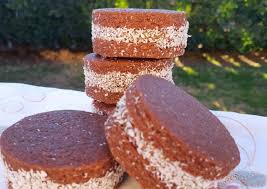 ALFAJOR SERRANO DE ALGARROBA Y HARINA INTEGRAL, RELLENO CON DULCE DE LECHE Y CENTRO DE DULCE DE MORAS ARTESANAL.